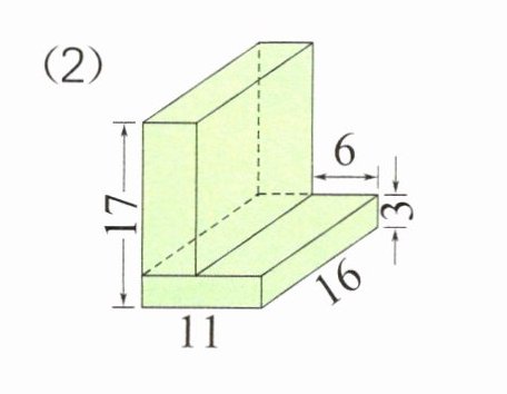 (2)宽:$11-6=5$(厘米) 高:$17-3=14$(厘米) $16×14×5+16×11×3=$ 1648(立方厘米)