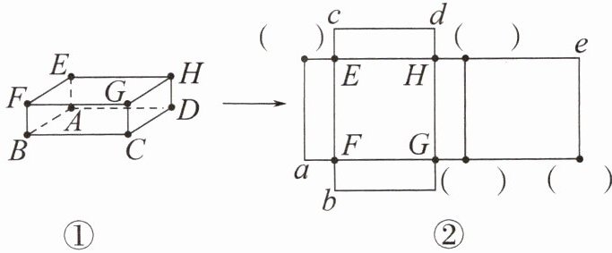 (1)请根据围好后长方体中已知顶点的位置,在图②括号里填写图①中相应点的字母。