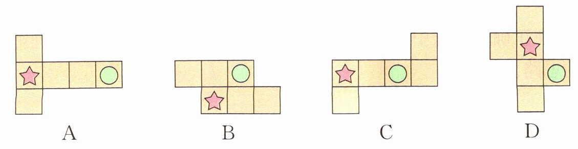 2. 一个正方体纸盒,如图所示。在两个相对的面上分别印有“●”和“★”两种图案。丽丽将这个正方体纸盒沿着棱剪开,得到的展开图可能是( )。