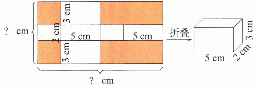 1. 数形结合 如图,从一张长方形纸上剪下部分(图中涂色部分)后,正好折叠成一个长方体。已知长方体的长、宽、高分别是5厘米、2厘米和3厘米,则原来长方形纸的面积是多少平方厘米?