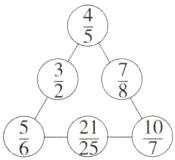 把$\frac{4}{5}$、$\frac{5}{6}$、$\frac{7}{8}$、$\frac{10}{7}$、$\frac{3}{2}$、$\frac{21}{25}$这六个数填入圆圈里,使三角形每条边上3个数的乘积都是1。