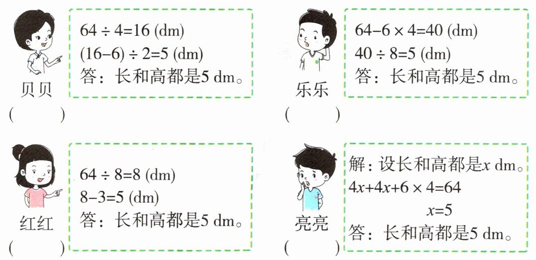 (2)示例:最喜欢贝贝的解法。 先用64÷4求出长方体一组长、宽、高的和,根据已知条件可知,长方体的长和高相等,再用(16-6)÷2即可求出长和高各是多少