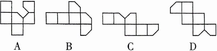 9. 如图,点A,B,C是正方体三条相邻的棱的中点,沿着A,B,C三点所在的平面将该正方体的一个角切掉,然后将其展开,其展开图可能是 ( )
