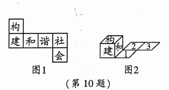 10. 如图 1 是一个正方体的侧面展开图,小正方体从图 2 的位置依次翻到第 1 格、第 2 格、第 3 格,这时小正方体朝上面的字是( )