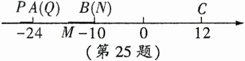 如图,数轴上有A,B,C三个点,分别表示有理数-24,-10和12。佳佳把两根木棒放在数轴上,使点Q与点A重合,点N与点B重合,点P在点Q的左边,点M在点N的左边,且PQ= 2,MN= 6。木棒MN从点B开始一直向右以每秒1个单位长度的速度匀速运动;木棒PQ同时从点A开始向右以每秒3个单位长度的速度匀速运动,当点Q运动到点C时,木棒PQ立即以每秒2个单位长度的速度返回(返回过程中,仍然保持点P在点Q的左边),当点Q再次运动到点A时,两根木棒立即同时停止运动。设运动时间为t秒。