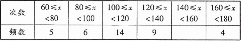 22. 某中学积极开展跳绳活动,体育委员统计了全班同学1分钟跳绳的次数,并列出来频数分布表,已知跳绳次数x在120≤x<140范围的同学占全班同学的20%。