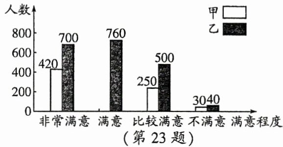 23. 某市开展了党员干部“一帮一扶贫”活动。为了解贫困群众对帮扶情况的满意程度,有关部门在该市所管辖的两个区内,分别随机抽取了若干名贫困群众进行问卷调查。根据收集的信息进行了统计,并绘制了如下尚不完整的统计图。已知在甲区所调查的贫困群众中,非常满意的人数占甲区所调查的总人数的35%,根据统计图解答下列问题: