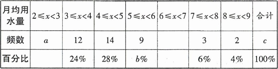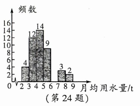 24. 小明为了解七年级500名学生的家庭生活用水情况,他随机调查了m个家庭月均用水量(单位:t),如下所示:【收集数据】4.7,2.0,3.1,2.3,5.2,2.8,7.3,4.3,4.8,6.7,4.5,5.1,6.5,8.9,2.0,4.5,3.2,3.2,4.5,3.5,3.5,3.5,3.6,4.9,3.7,3.8,5.6,5.5,5.9,6.2,5.7,3.9,4.0,4.0,7.0,3.7,8.3,4.2,6.4,3.5,4.5,4.5,4.6,5.4,5.6,6.6,5.8,4.5,6.2,7.5。小明利用所学的统计知识,绘制了样本的频数分布表和频数分布直方图: