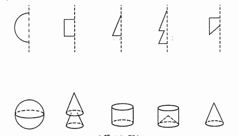 5. 第五个图形(梯形)绕虚线旋转一周,形成一个圆台,对应第二行的第四个几何体(圆台)。