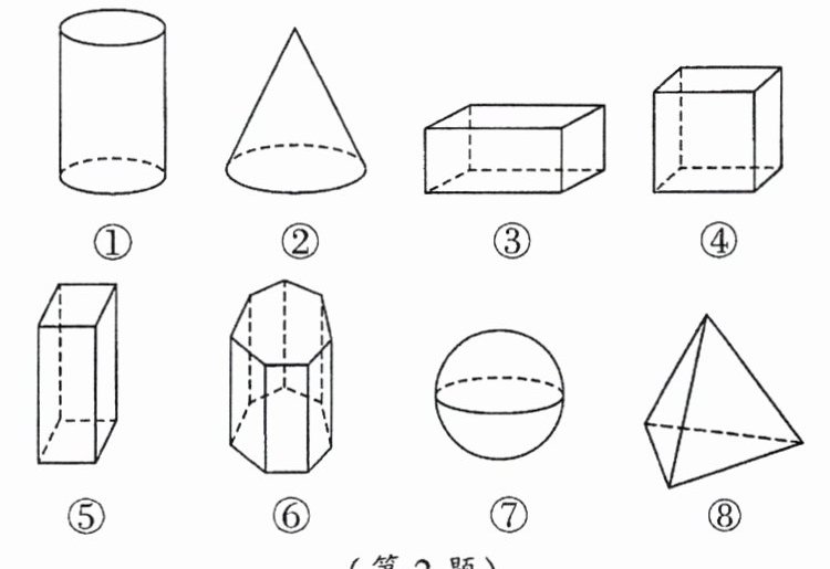(2)按柱、锥、球分:②④⑤为柱体;③为锥体;①为球体。按有无曲面分:①②③有曲面;④⑤无曲面。按有无顶点分:③④⑤有顶点;①②无顶点。
