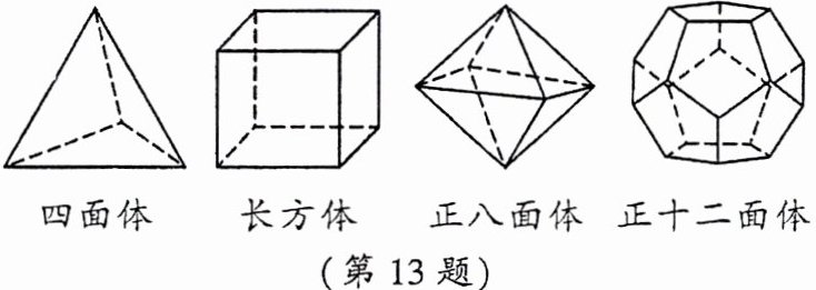 13. 十八世纪瑞士数学家欧拉证明了简单多面体中顶点数(V)、面数(F)、棱数(E)之间存在一个有趣的关系式,被称为欧拉公式。请你观察下列几种简单多面体模型,解答下列问题: