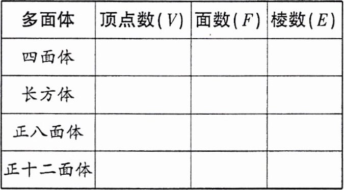 | 多面体 | 顶点数(V) | 面数(F) | 棱数(E) |