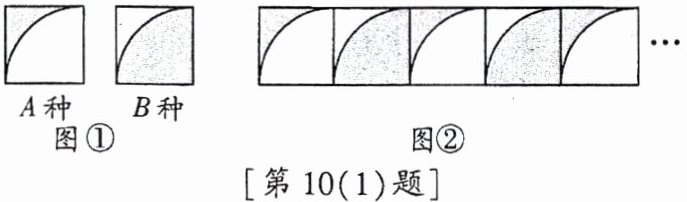 10. (1)边长为2的两种正方形卡片如图①所示,卡片中的扇形半径均为2。图②是交替摆放A,B两种卡片得到的图案。若摆放这个图案共用两种卡片21张,则这个图案中阴影部分的面积和为______;(结果保留π)