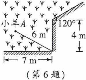 6. 如图,一根6m长的绳子,一端拴在围墙墙角的柱子上,另一端拴着一只小羊A(羊只能在草地上活动),那么小羊A在草地上的最大活动区域面积是$______m^2。$