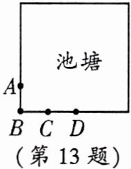 13. 如图,边长为12m的正方形池塘的周围是草地,池塘边A,B,C,D处各有一棵树,且AB= BC= CD= 3m。现用长4m的绳子将一头牛拴在其中一棵树上。为了使牛在草地上活动区域的面积最大,应将绳子拴在哪棵树上?