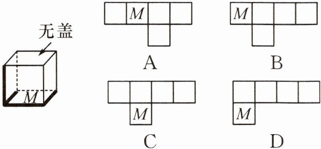 13. 如图,这是一个无盖的正方体纸盒,它的下底面标有字母“M”,沿图中的粗线将其剪开展成平面图形,则这个平面展开图是(