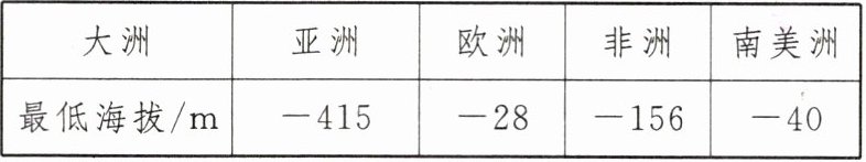 7. (2024·辽宁)亚洲、欧洲、非洲和南美洲的最低海拔如下表: