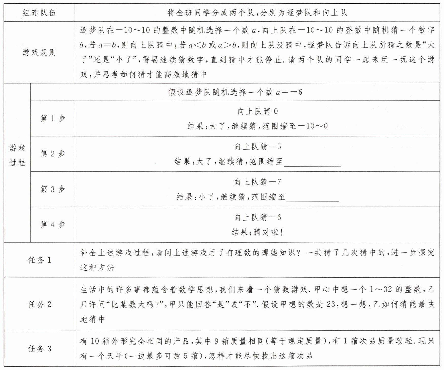 任务1:游戏过程:-10∼ -5 -7∼ -5 有理数的大小比较,一共猜了4次,每次都是猜中间的数,逐步缩小范围,直至猜中.任务2:乙可以采用对分法以下猜数的过程.①乙:比16大吗?甲:是.②乙:比24大吗?甲:不.③乙:比20大吗?甲:是.④乙:比22大吗?甲:是.⑤乙:23.所以乙猜中甲想的数是23.任务3:①将这10箱分成5箱和5箱两部分,则次品在较轻的5箱中;②将较轻的5箱分成2箱、2箱和1箱三部分,则次品在较轻的2箱中;若2箱的两部分一样重,则次品刚好是那1箱;③将较轻的2箱分成1箱和1箱两部分,则次品是较轻的那1箱.
