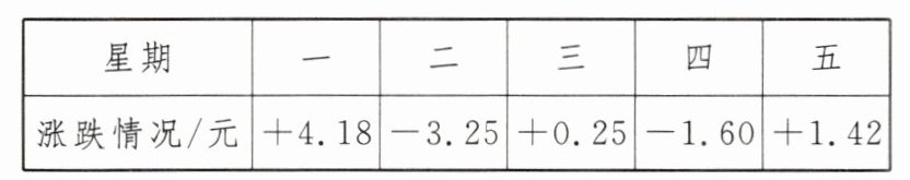解:+4.18-3.25+0.25-1.60+1.42=1(元). 答:这只股票星期五的价格与上星期五相比,上涨了1元.
