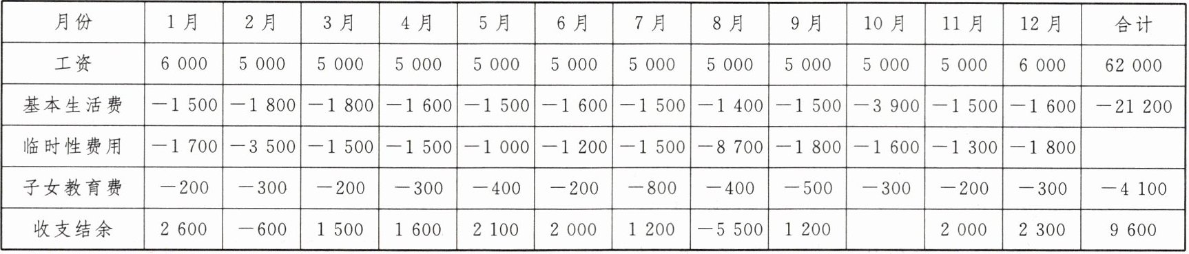 (2)小明家临时性费用开支较大,子女教育费用相对较小,今后应减少临时性开支,例如:适当减少节日采购、礼金、旅游等费用,养成节约的好习惯,适当加大子女教育费用.(答案不唯一)