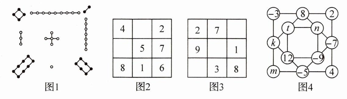 【阅读】幻方的历史悠久,传说最早出现在夏禹时代的“洛书”(如图 1)。“洛书”是一种关于天地空间变化脉络的图案,它以黑点与白点为基本要素,以一定方式构成若干个不同的组合。“洛书”用今天的数学符号翻译出来就是一个三阶幻方(如图 2),三阶幻方又名九宫格,是一种将数字 1~9(数字不重复使用)安排在三行三列的正方形格子中,使每行、每列和每条对角线上的数字之和都相等。