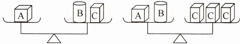 10. 如图,天平两边盘中标有相同字母的物体的质量相同. 若两架天平保持平衡,1 个砝码 A 与 $ n $ 个砝码 C 的质量相等,则 $ n $ 的值为(