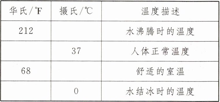 12. A|杭州外国语校本经典题 有的温度计有华氏、摄氏两种温标,华氏 $ F(^{\circ}F) $、摄氏 $ C(^{\circ}C) $ 的转换公式是 $ F = 1.8C + 32 $. 请填写下表.
