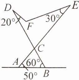 12. 如图,这是可调节躺椅的示意图(数据如图),$AE$与$BD$的交点为$C$,且$\angle CAB$,$\angle CBA$,$\angle E$保持不变。为了舒适,需调整$\angle D$的大小,使$\angle EFD = 110^{\circ}$,则图中$\angle D$应________(填“增加”或“减少”)________。(填度数)