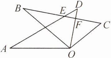13. 如图,$\triangle AOD\cong\triangle BOC$,$\angle COD = 40^{\circ}$,$AD$与$BC$相交于点$E$,$OD$与$BC$相交于点$F$,则$\angle DEC$的度数为______.