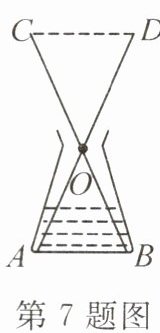 7. 新考向 真实情境 在生物实验课上,老师布置了“测量锥形瓶内部底面内径”的任务. 小亮同学想到了以下这个方案:如图,用螺丝钉将两根小棒 AD,BC 的中点 O 固定,利用全等三角形的性质,只要测得 C,D 之间的距离,就可知道内径 AB 的长度. 此方案中,判定△AOB 和△DOC 是全等三角形的依据是