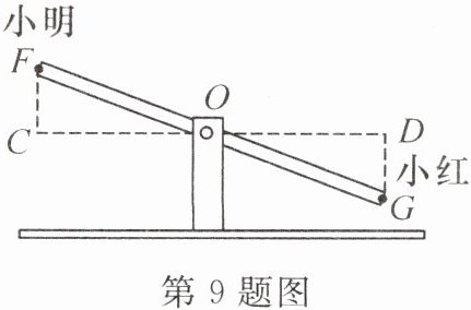 9. 如图,小明与小红玩跷跷板游戏,支点$O$是跷跷板的中点,两人分别坐在跷跷板的两端(即$OF = OG$)。如果点$O$距地面的距离是$60\mathrm{cm}$,那么当小明从水平位置$CD$上升$15\mathrm{cm}$时,小红距地面的高度是