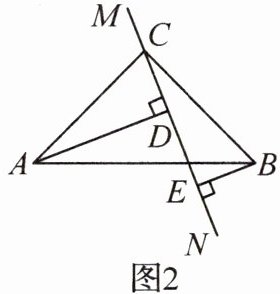 (2)当直线MN处在图2的位置时,直接写出DE,AD,BE之间的数量关系.
