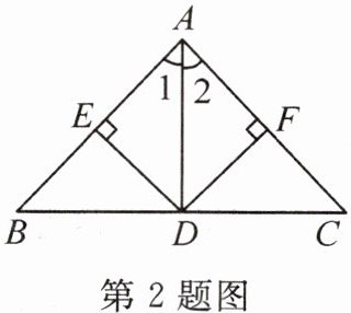 2. 如图,若$DE \perp AB$,$DF \perp AC$,则对于$\angle 1$和$\angle 2$的大小关系,下列说法正确的是()