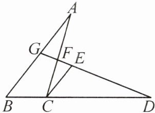 6. 如图,在$\triangle ABC$中,$D$是$BC$延长线上一点,满足$CD=AB$,过点$C$作$CE// AB$且$CE=BC$,连接$DE$并延长,分别交$AC$,$AB$于点$F$,$G$.