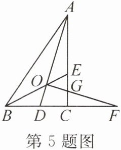 5. (2024·南充期末)如图,在$Rt\triangle ABC$中,$\angle ACB=90^{\circ}$,$Rt\triangle ABC$的角平分线$AD$,$BE$相交于点$O$,过点$O$作$OF\perp AD$,交$BC$的延长线于点$F$,交$AC$于点$G$,有下列结论: