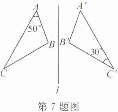 7. 如图,△ABC 与△A′B′C′关于直线 l 对称,∠A=50°,∠C′=30°,则∠B 的度数为