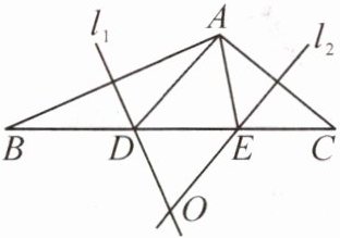 14. 湖南师大附中校本经典题 如图,在△ABC中,AB的垂直平分线l₁交BC于点D,AC的垂直平分线l₂交BC于点E,l₁与l₂相交于点O,△ADE的周长为6.