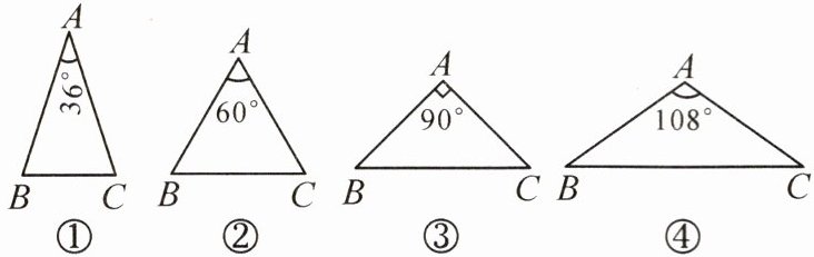 12. 如图,下列 4 个三角形中,均有 AB = AC,则经过三角形的一个顶点的一条直线能够将这个三角形分成两个小等腰三角形的是 (