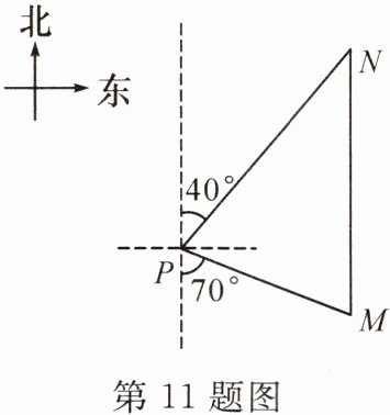 11. A|北京五中校本经典题 如图,一艘海轮位于灯塔 P 的南偏东 70°方向的点 M 处,它以 40 海里/时的速度向正北方向航行,2 小时后到达位于灯塔 P 的北偏东 40°的点 N 处,则点 N 处与灯塔 P 的距离为 (