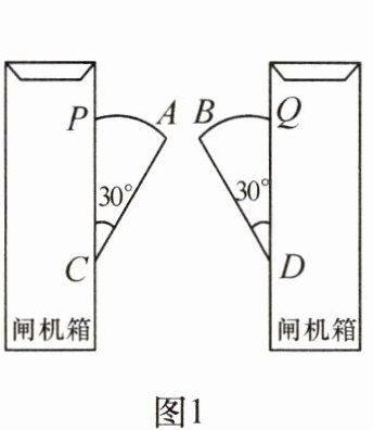 11. 高铁站入口的双翼闸机如图1所示,它的双翼展开时,双翼边缘的端点$A$,$B$之间的距离为$10cm$,双翼的边缘$AC = BD = 54cm$,且与闸机侧立面夹角$\angle ACP = \angle BDQ = 30^{\circ}$。