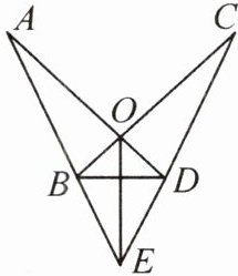 证明:在$\triangle AOB$和$\triangle COD$中,$\left\{\begin{array}{l}\angle A=\angle C,\\ OA=OC,\\ \angle AOB=\angle COD,\end{array}\right. \therefore \triangle AOB≌\triangle COD$(ASA).$\therefore OB=OD$.$\therefore$点O在线段BD的垂直平分线上.$\because BE=DE$,$\therefore$点E在线段BD的垂直平分线上.$\therefore OE$垂直平分BD.