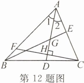 12. 如图,在△ABC 中,∠1 = ∠2,G 为 AD 的中点,连接 BG 并延长,交 AC 于点 E,过点 C 作 CH⊥AD 于点 H,延长 CH 交 AB 于点 F。下列说法错误的是(