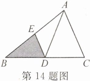 14. 如图,在△ABC 中,D,E 分别是边 BC,AB 的中点。若△ABC 的面积等于 8,则△BDE 的面积等于