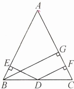 5. 如图,在△ABC 中,$ AB = AC $,$ DE \perp AB $,$ DF \perp AC $,$ BG \perp AC $,垂足分别为 E,F,G. 求证:$ DE + DF = BG $.