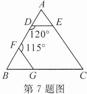 7. (2023·徐州)如图,在 $ \triangle ABC $ 中,若 $ DE // BC,FG // AC,\angle BDE = 120^{\circ},\angle DFG = 115^{\circ} $,则 $ \angle C = $