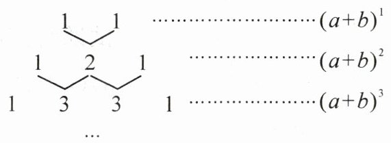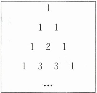 2. 我国古代数学的许多发现都曾位居世界前列,其中“杨辉三角”就是一例. 如图,这个三角形的构造法则:两腰上的数都是 1,其余每个数均为其上方左、右两数之和,它给出了$(a + b)^n$($n$为正整数)的展开式(按$a$的次数由大到小的顺序排列)的系数规律. 例如,在三角形中第三行的三个数 1,2,1,恰好对应$(a + b)^2 = a^2 + 2ab + b^2$展开式中的系数;第四行的四个数 1,3,3,1,恰好对应$(a + b)^3 = a^3 + 3a^2b + 3ab^2 + b^3$展开式中的系数;等等.