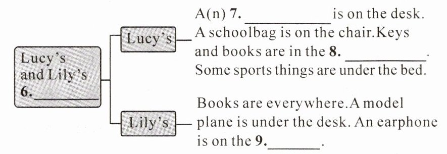 Please look at the picture of Lily's room. You can see her books are on thebed,on the desk and in the bookcase. She has a white model plane(飞机模型). It's under the desk. The green earphone(耳机) is hers. It's on thebed. "Where are my keys? Where is my hat? Where is my ruler?" She always asks when she can't find them.