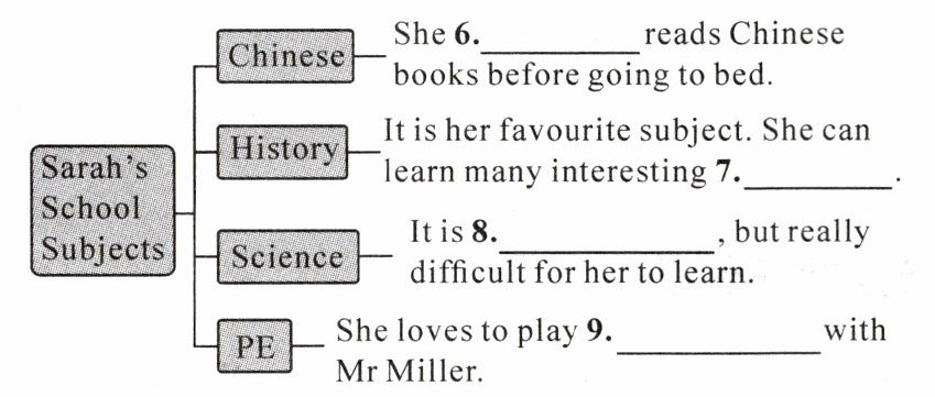 I'm Sarah. I'm a middle school student. At school, we have seven subjects—maths, English, Chinese, science, PE, history and music. My mother says Chinese is useful! I like Chinese. I always read Chinese books before I go to bed. I also like history. It is my favourite subject. Mr Brown is great fun. In his history class, I can learn (学习) many interesting stories.