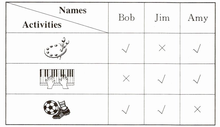 1. paint/draw; play football; play the piano 2. play the piano and play football; can't paint/draw 3. can paint/draw and play the piano, but she can't play football