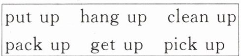 1. pack up 2. Hang up 3. get up 4. clean up 5. picked up 6. put up